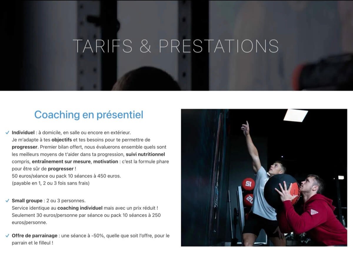 Site “premier prix” composé de trois pages claires présentant les services de coaching sportif, les tarifs, et les informations de contact.